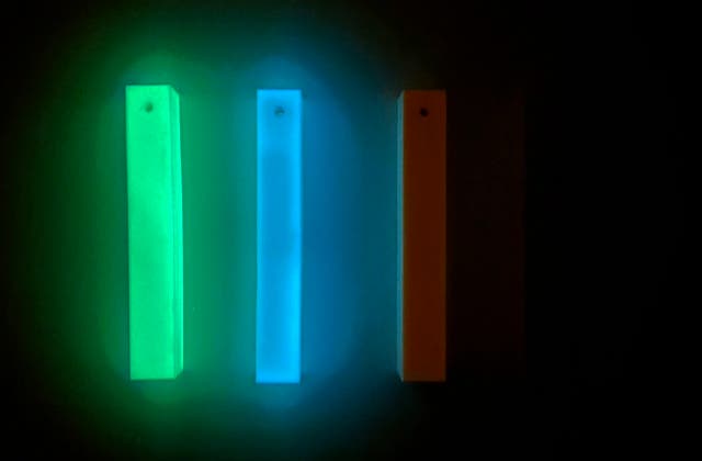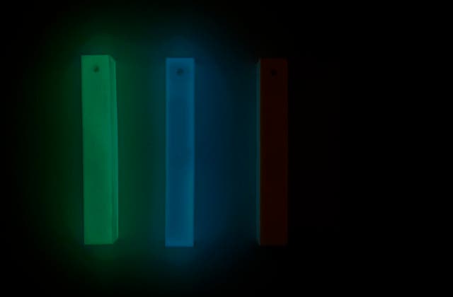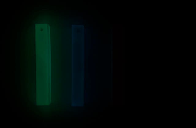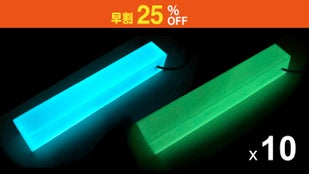 素材の特性上ブルーは、グリーンに比べて光が弱いです。長く光るのは蓄光カラーの定番「グリーン」です。