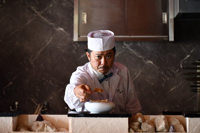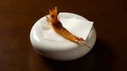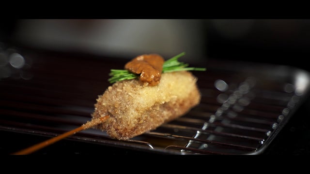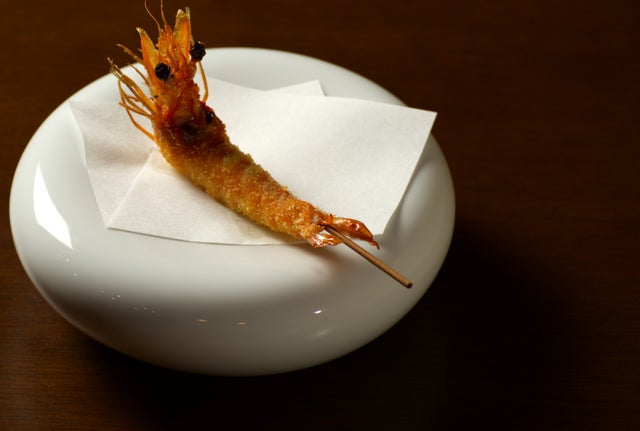 揚げ温度と時間を常にコントロールし、表面はカリッと揚げ、中はレアな状態で。時によってウニやいくらを乗せて提供します。提供スタイルは当日のお楽しみになっています。