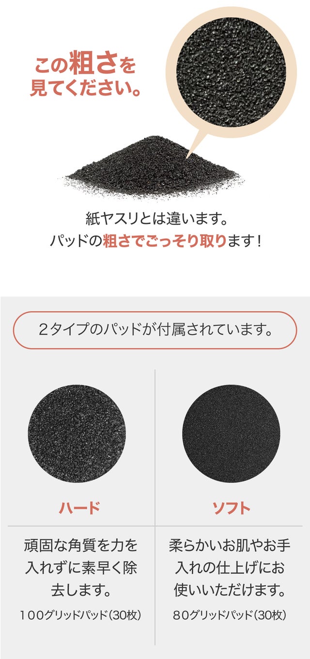 - 360℃自動回転により曲がったかかとを均一に角質をしっかり除去