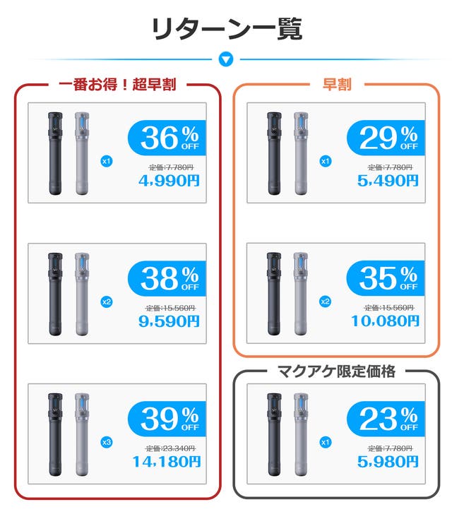 ※各コースごとに設定しておりますスケジュールにて随時お届けを予定致しておりますが、ご注文状況より出荷時期が遅れる場合または、早くなる場合があります。 ※通常使用の範囲外での製品保証は承れません。 ※使用感などに関しては、感じ方に個人差が予想される製品でございます。 そのため、使用感等に関する返品・返金はお受けいたしかねます。 ※並行輸入品が発生する可能性があります。個人輸入及び販路によっては防ぐことができない可能性がある点、ご了承願います。 ※並行輸入品は正規代理店による製品保証を受けることができません。 また、正規代理店を通じて購入することで、日本国内での流通に必要な各種認証の取得や、関税の適切な処理が担保されます。 ※一部国内に類似商品が出回っている場合がございます。弊社では他社の類似品に関してのお問い合わせには対応できませんのでご了承ください。 ※発売前の製品につきましては、デザイン・仕様が一部変更になる可能性もございます。 ※本プロジェクトを通して想定を上回る皆様から応援購入を頂き、現在進めている環境から量産体制を更に整えることができた場合、正規販売価格が販売予定価格より下がる可能性もございます。 応援購入サービスの性質上、以上の注意点につきましてあらかじめご理解とご了承いただいた上で応援購入して頂くようよろしくお願い申し上げます。 ※本文内に記載させて頂いたスケジュールは、あくまでプロジェクト公開時点の予定です。当社では配送遅延を予測し、余裕を持った配送予定時期を設けていますが、応援購入の性質上、それでも場合によっては配送遅延の恐れがございます。ご了承くださいませ。 ※原則として、配送遅延に伴う応援購入のキャンセルは出来ませんが、リターン配送の予定月から3ヶ月を超えた場合には、希望者に限りキャンセルにて対応させて頂きます。