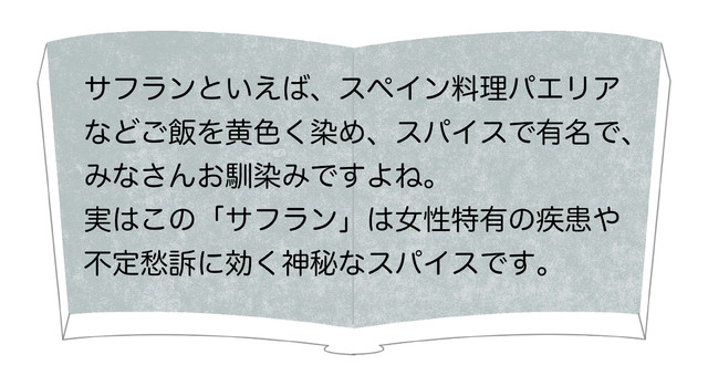神経に作用するサフランの鎮静作用は、腹部の痛みや頭痛を和らげたり、胃腸の消化を助け、抗酸化力もあり生理前症候群を和らげます。