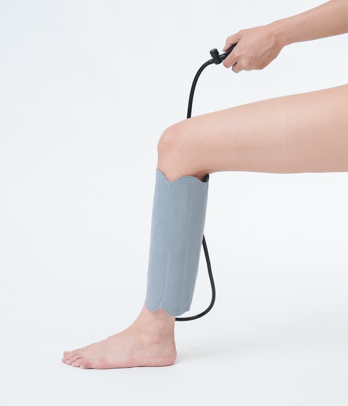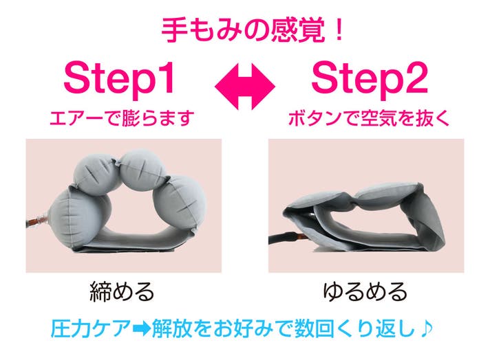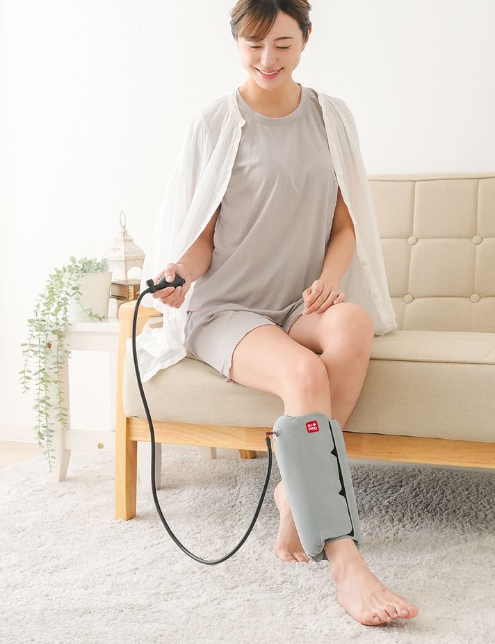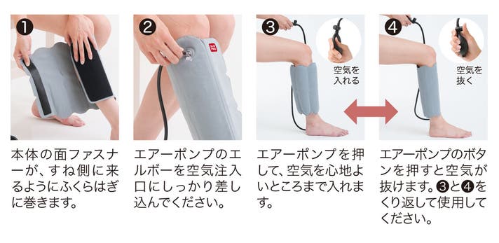 エアーポンプで空気を送り込むだけで、ふくらはぎ全体をむぎゅ~っと圧力ケア!空気の量はお好みで調整できるので、心地よいと感じる圧力にあわせてご使用いただけます。