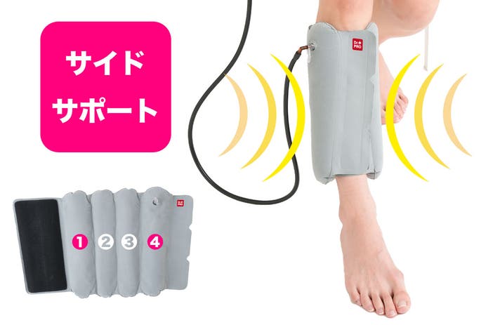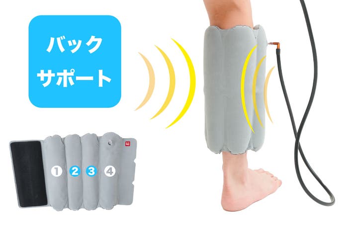 エアーポンプで空気を送り込むと、①と④の空気層はふくらはぎの両サイドから徐々に圧が入り、程よくケアしてくれます♪