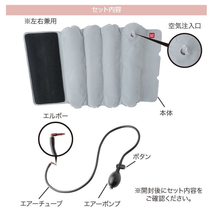 ●本品は医療機器ではありません。疾病の治療用としてご使用しないでください。●18歳未満の方は、骨格の成長期にあたるのでご使用しないでください。●使用箇所が現在治療中の方は、本品のご使用について専門医にご相談ください。●就寝時はご使用しないでください。●ご使用中またはご使用後に異常を感じた場合は直ちにご使用を中止してください。●お肌に合わない場合やかぶれ、かゆみ等を感じた場合はご使用を中止してください。●傷・かぶれ・湿疹などのある場合にはご使用しないでください。●空気を入れ過ぎると破損するおそれがあります。●汚れた場合は固く絞った柔らかい布などで拭き取ってください。●乳幼児の手の届かない場所に保管してください。●火気のそばや高温多湿な場所、直射日光の当たる場所には保管しないでください。●本来の目的以外ではご使用しないでください。●廃棄する場合は、各自治体の指示に従って処分してください。●本品の仕様やデザインは変更する場合があります。