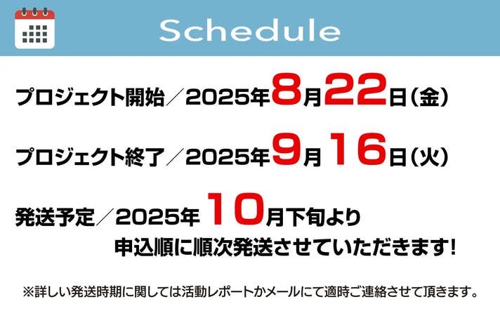 プロジェクト終了後お申し込み順に、順次に発送させていただきます。