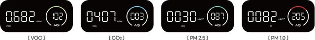 A. ヒューマアイ AQIは、 VOC、CO2、PM1.0、PM2.5、PM10の各測定値を換算した総合大気質指数であり、以下の 基準で表示されます。 良いレベル:0〜50(青) ~中程度のレベル:51〜100(緑) ~悪いレベル: 101〜200 (黄色)~不健康なレベル:201〜500(赤)に数値と色が変わります。