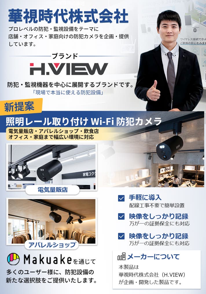 ※本製品は防犯カメラです。照明の機能はありません。 ※ 本製品は 照明用ライティングレールが設置されている場所専用 の防犯カメラです。 ※ ライティングレールがない場所には設置できません。 ※ 使用環境や個人差により、効果や感じ方に差が生じる場合がございます。 ※ 並行輸入品が発生する可能性がございます。正規ルート以外から購入された製品は、サポート対象外となります。 ※ リターン品の配送が完了するまで、華視時代株式会社が日本国内における正規販売・サポートを行います。 ※ 正規ルートでご購入いただくことで、日本国内流通に必要な各種審査・関税処理が適切に行われます。 ※ 国内外に類似商品が流通する可能性がございますが、他社製品に関するお問い合わせには対応いたしかねます。 ※ デザイン・仕様・カラー等が一部変更となる場合がございます。 ※ 応援購入数が想定を上回った場合、製造工程等の都合により出荷時期が前後する可能性がございます。 ※ 使用感には個人差があるため、使用感を理由とした返品・返金はお受けできません。 ※ 初期不良を除き、返品・交換はお受けできません。 ※ 応援購入状況により、将来的に一般販売価格が予定価格を下回る可能性がございます。 ※ 記載のスケジュールはプロジェクト公開時点の予定であり、配送遅延が生じる可能性がございます。 なお、リターン配送予定月から 2ヵ月を超えた場合 には、希望者に限りキャンセル対応を行います。 上記内容をご理解・ご了承のうえ、応援購入いただけますと幸いです。 原則として、サポーター都合によるキャンセル・返金は承っておりません。 (サポーター都合のキャンセル不可の例:サイズが合わない、誤注文、長期不在) ◾️対応条件: 商品の初期不良、またはお届けした商品がご注文内容と異なる場合、到着後14日以内にプロジェクトページの「実行者にメッセージ」よりご連絡ください。状況を確認の上、返金対応、または良品との交換対応をさせていただきます。 ◾️返金額: リターン金額(税込)の全額 ◾️返品送料/再送料: 実行者負担 【返品・交換をお受けできない商品】 ・サポーターの責任により破損、汚損が生じた商品 ・商品のタグ、付属品、パッケージ(箱、袋など)を紛失、破棄された商品 ・事前にご連絡をいただいていない商品 ・商品到着後、15日以上経過した商品 【交換をお受けできないケース】 ・限定品や同一商品の在庫がない場合など、代替品をご用意できない商品 製造者 :中国