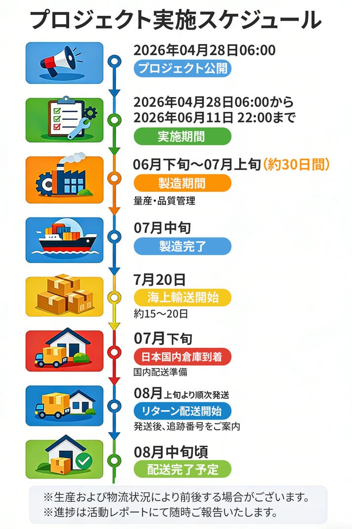 このプロジェクトはAll in型です。目標金額の達成に関わらず、プロジェクト終了日の2026年06月11日までに支払いを完了した時点で購入が成立します。