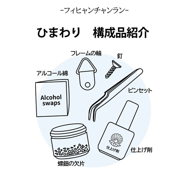 FAQ ・本物の螺鈿ですか? ->天然の螺鈿です。 アワビ、真珠、夜光貝など多様なテクスチャのため色んな種類を分類し、入れました ・他にMakuakeプロジェクトを企画していますか? ->現在のところ、ありません ・螺鈿欠片が少なく見えますが大丈夫ですか? ->螺鈿が薄いため、少なく見える場合があります 面積を考え、十分な量を入れております ・螺鈿をつけることが難しいです ->一日で作れるキットでなく、時間をかけて丁寧に作る作品です 焦らずにゆっくりと螺鈿の輝きを楽しんでください ・螺鈿だけ注文することはできますか? -> 螺鈿の追加注文はできません ・子供でも作られますか? -> 繊細で几帳面な性格を持ってる子供たちなら、8歳以上からお勧めします 但し、螺鈿の切り口が鋭いため、保護者と一緒に作業することをお勧めします ・仕上げ剤が服についてしまいました。どうすればいいでしょうか? -> すぐ水で洗濯してください 時間が経つと固まる恐れがあります