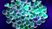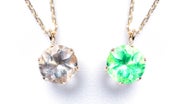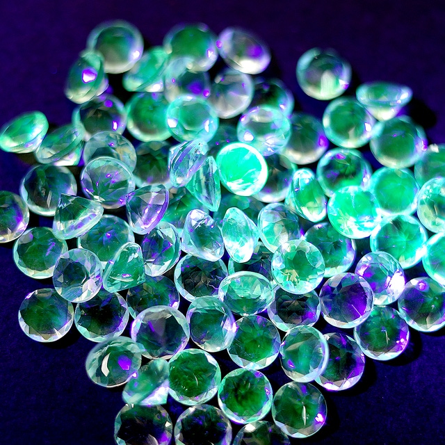 透明度の高い、自然の木漏れ日を閉じ込めたとようなライトグリーンの輝きをしていますが、ブラックライトを当てると、なんと宝石がネオンに輝く特性を持っています。