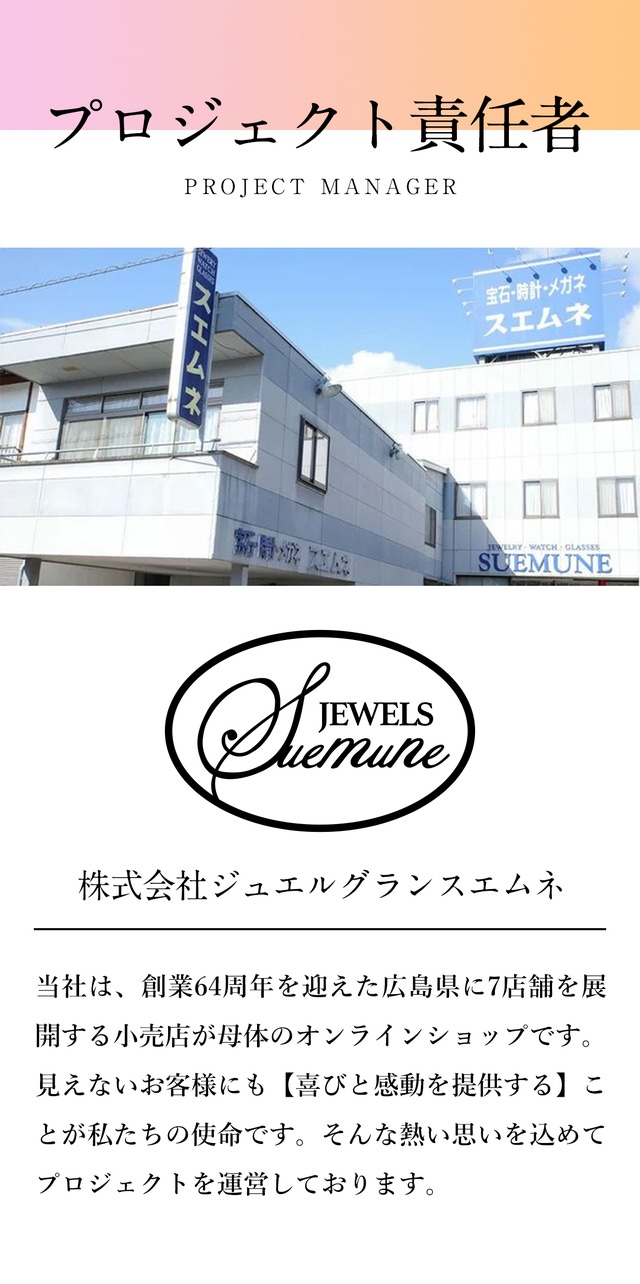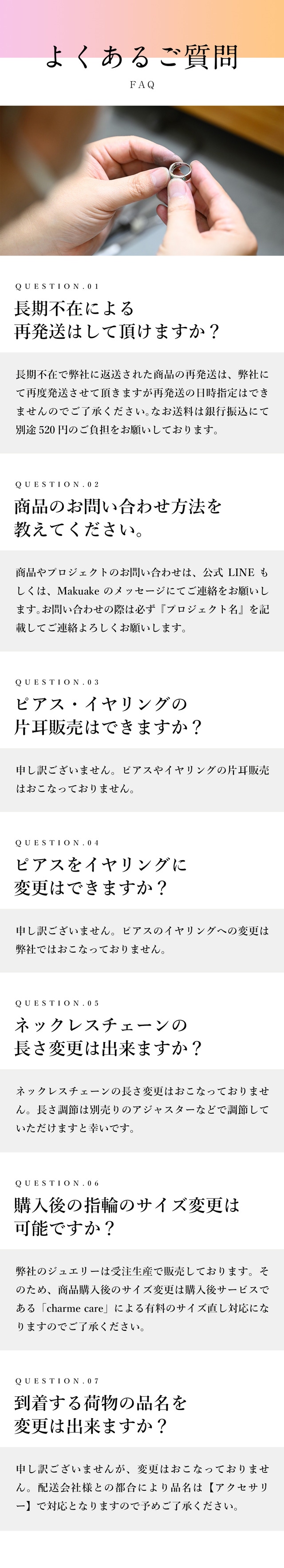 私たちは【シャルムジュエリー】を制作するために、工場とデザイン・仕様を実現できるよう、プロジェクトを誠心誠意進めています。 しかしながら開発中の工程において、デザイン・使用が一部変更になる可能性もございます。製造スケジュールについては、プロジェクト成功を想定した数で調整しておりますが、想定を上回る応援の申し込みがあった場合、製造や発送に伴うやむを得ない事情によりお届けが遅れる場合がございます。上記のようにプロジェクトページに記載している内容に変更がある場合は、活動レポートなどで共有を行っていく予定です。 本文中に記載させていただいたスケジュールは、あくまでプロジェクト公開時点の予定です。応援購入の性質上、配送遅延のおそれがございます。 原則として、配送遅延に伴う応援購入のキャンセルはできませんが、リターン配送予定月から3ヵ月を超えた場合には、希望者に限りキャンセルにて対応させていただきます。