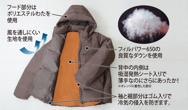 フィルパワー650の良質なダウンを使用。さらに背中の内側には吸湿発熱シートを入れることで、薄手なのにポカポカ背中からあったかに仕上げました。
