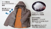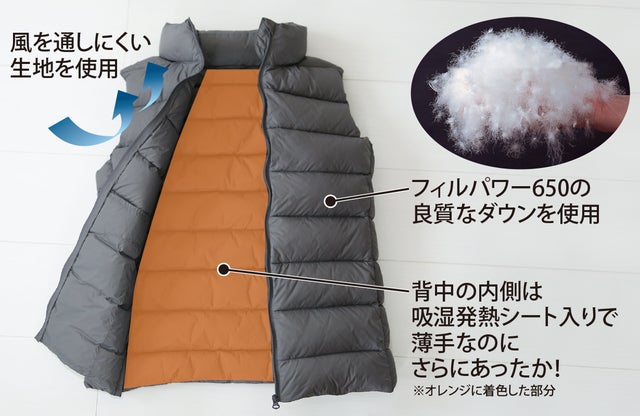 フィルパワー650の良質なダウンを使用。さらに背中の内側には吸湿発熱シートを入れることで、ポカポカ背中からあったか仕様です。防風構造で風も通しにくく、冷気も入りにくい工夫を施しました。