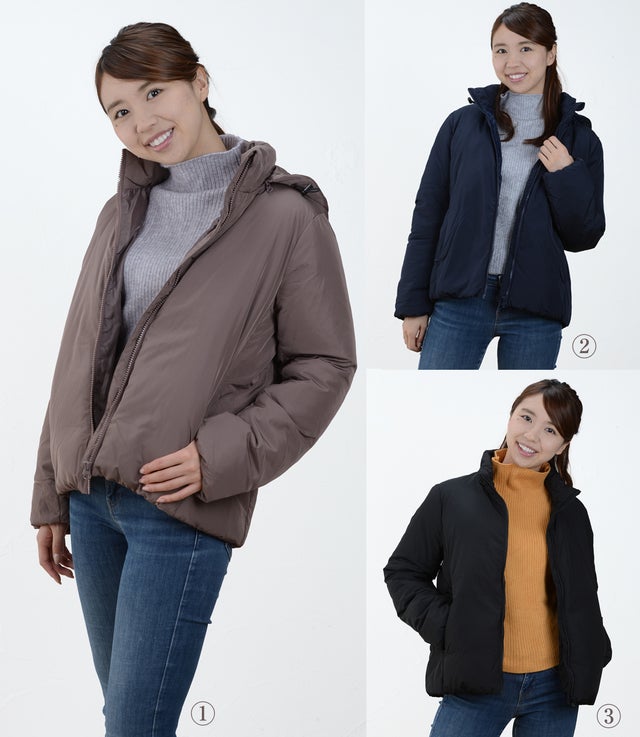 レディース ダウンパーカーは①モカ、②ネイビー、③ブラックの3色です。