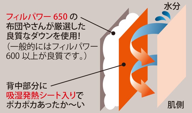 保温性に優れた羽毛に、さらに背中内側に吸湿発熱シートをプラスしました。