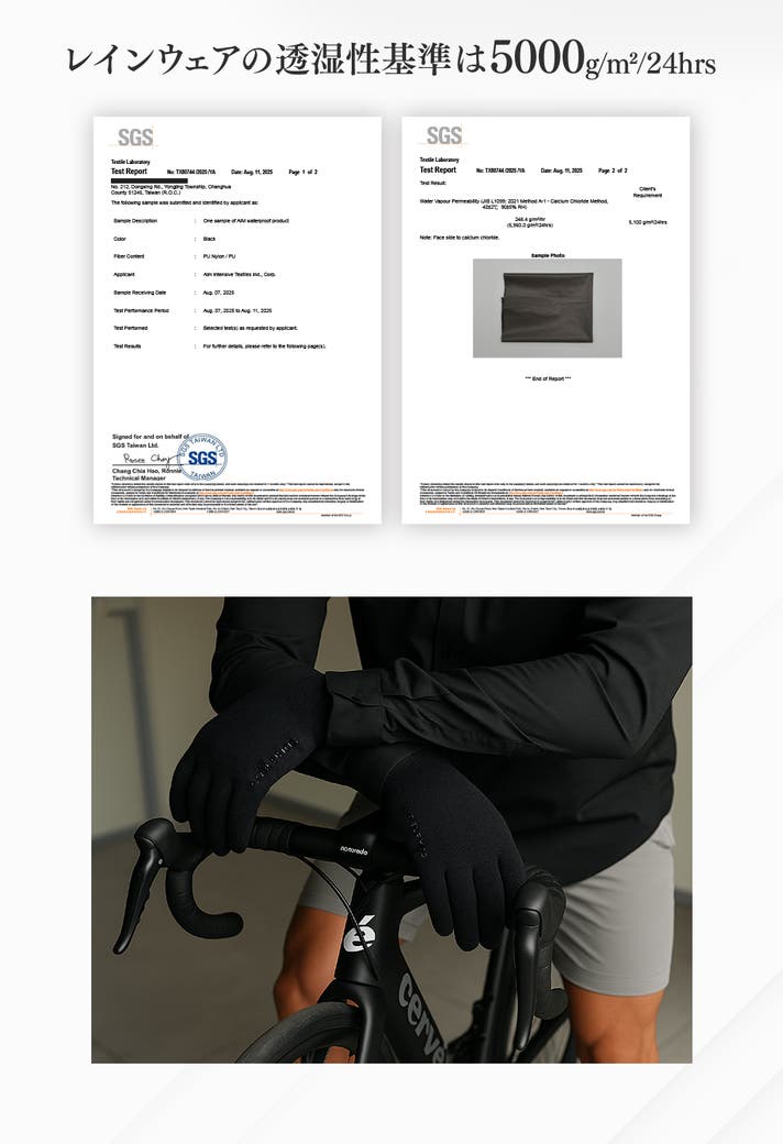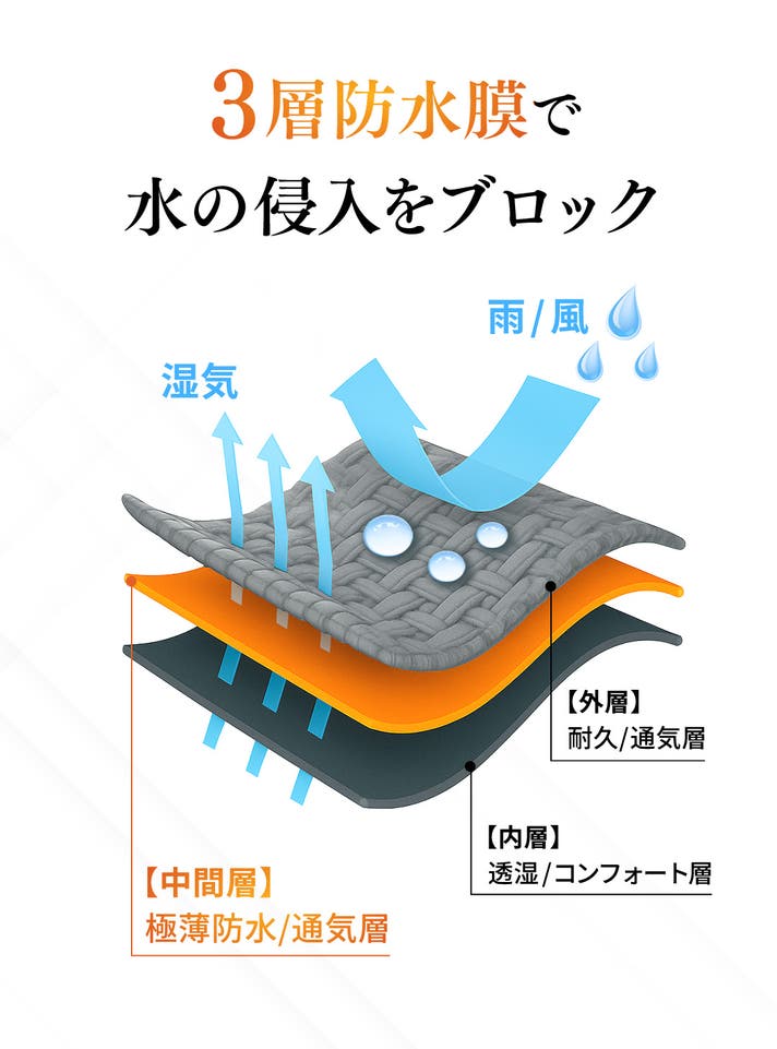 A. 中間層の防水フィルムには「透湿性」があり、内部の湿気を外に逃がす特徴があります。そのため、一般的な防水手袋に比べて蒸れにくく、快適にご使用いただけます。