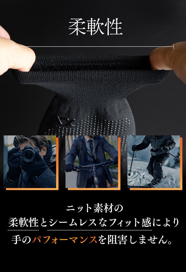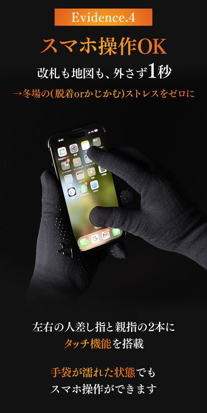 左右の親指と人差し指にタッチパネル対応素材を使用しており、一般的なスマートフォン操作が可能です。