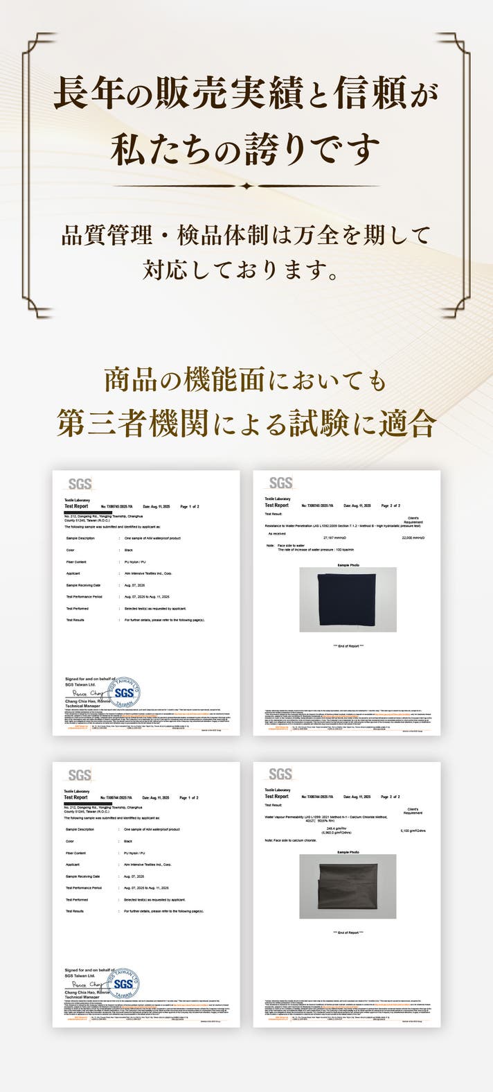 A. 表面のニット自体は防水ではありませんので濡れます。ただし、中間層に防水透湿フィルムを使用しているため、水は内部まで浸透しにくい設計に。