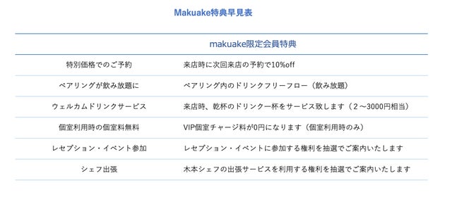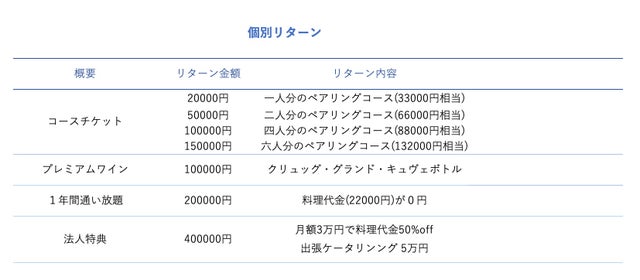 通常、完全予約制のシェフおまかせコース 12品(22,000円)のみ提供しておりますが、通常のコースを軸にmakuake 限定で用意したスペシャルな特典をリターンにてご用意いたしました。