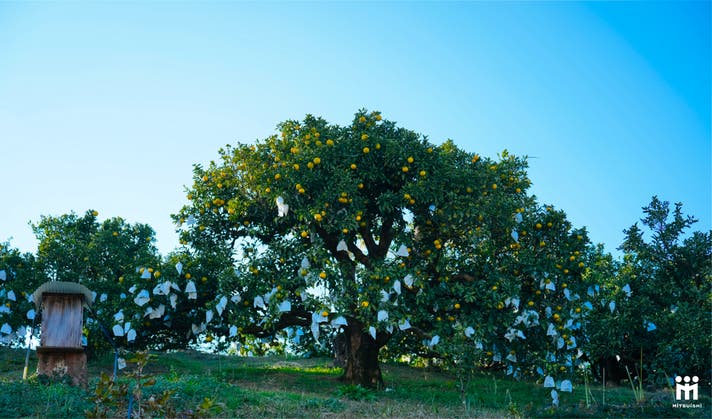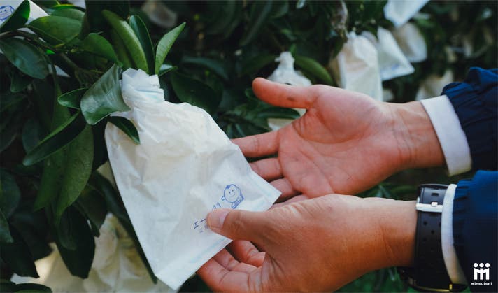 日向夏を育てるには、実に多くの人の手がかかっていることが分かりました。まず、日向夏は人工受粉しないと実がつかないため、日向夏1個ずつ手作業で受粉をしなければなりません。また、露地で育てられる日向夏は熟すにつれて黄色味が増し、甘く美味しくなるのですが、鳥や獣も日向夏の美味しさを知っているので、その被害を防ぐために日向夏1房ずつに紙製の袋を掛けます。これも1個ずつ手作業で行われます。収穫も手作業です。