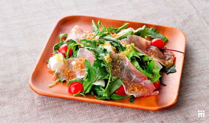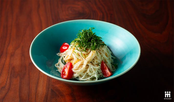 麵つゆと日向夏ドレッシングを2対1で合わせソースをつくります。具材として、ざく切りしたトマトと千切りしたハムを用意します。氷水でしめて水を切った茹でパスタにソースと具材を絡め、線切りした大葉をかけてできあがり!食欲をそそる新感覚パスタの出来あがりです。