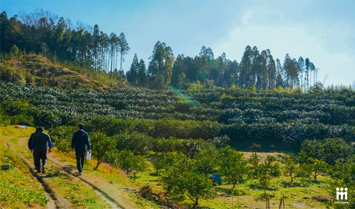 広大な日向夏の果樹園の下に生える草もの草刈りも大変です。除草剤を使用せずに、人の手で定期的に刈ることで果樹ができるだけ長く生きられるように環境を整えています。