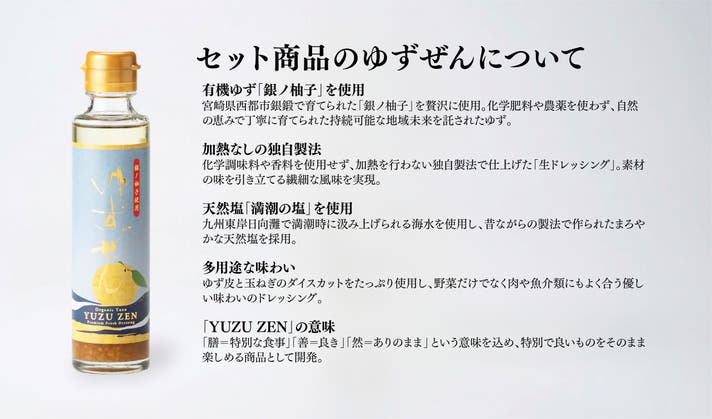 「ゆずぜん」とは、「なつぜん」の前に開発したプレミアムなゆずドレッシングですです。ゆずぜんは、宮崎県産の有機ゆずを使用した商品で、ミツイシの商品の中でも根強いファンがいらっしゃいます。海外の客様からも高い評価をいただいています。