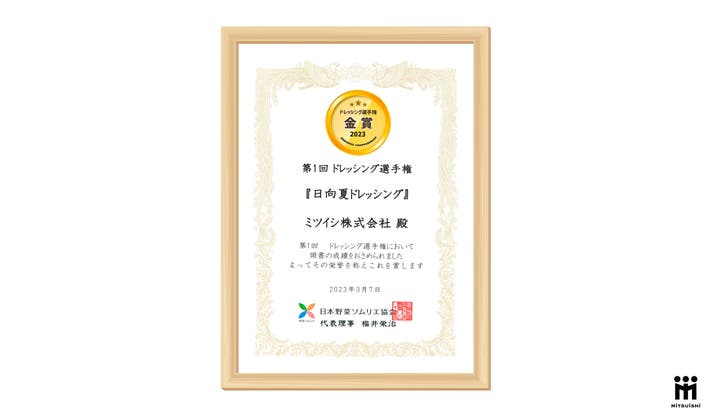 ミツイシの「日向夏ドレッシング」は全国91品の中から選ばれ、2023年 日本ソムリエ協会主催「第1回ドレッシング選手権」で金賞受賞。全国のカルディコーヒーファームや有名スーパーでもご採用いただいており、発売からのシリーズ累計500万本以上の販売実績をもつ、宮崎のご当地ドレッシングです。