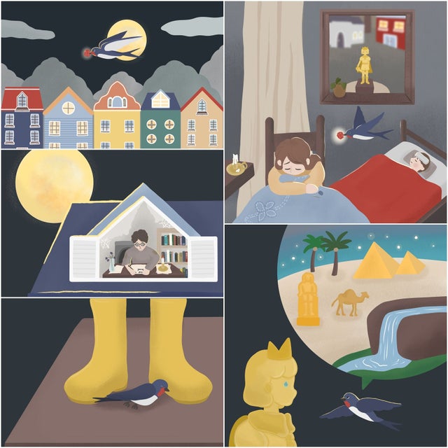 「Happy Prince/幸福な王子」は英国劇作家で短編小説作家のオスカー・ワイルドが19世紀に自分の子供たちに聞かせるために書かれました。誰かのために自分の大事なものを犠牲にする王子とそこに寄り添うツバメのお話で、ある時ツバメが王子の銅像の上で休んでいると、王子が涙を流している姿を見るというところから話は展開していきます。 幸福な王子は、ツバメの協力を得て病気の子供、屋根裏部屋で寒さに震える若者、冬の広場でマッチ売りをする素足の少女に自分の目にある宝石を順番に配っていきます。 最後には自分の体を覆っていた黄金までも苦しむ人々に届けるのです。しかし人々はすっかり華やかさを失った王子の銅像を火の中に入れて溶かしてしまうのです。ただ王子の心臓は残りツバメと一緒に天使に呼ばれ、天国に行くというお話です。 どの時代にも依然として残る世界的深刻な貧富の格差に気づき、分かち合いの心の意味を教えてくれる感動の名作童話です。