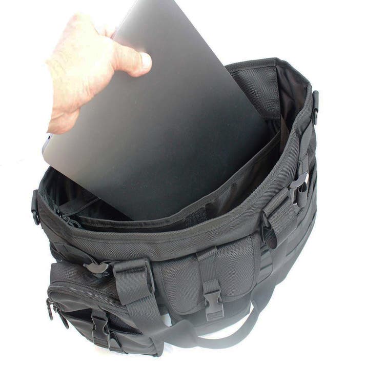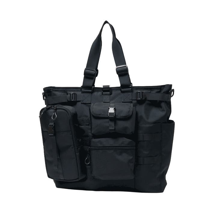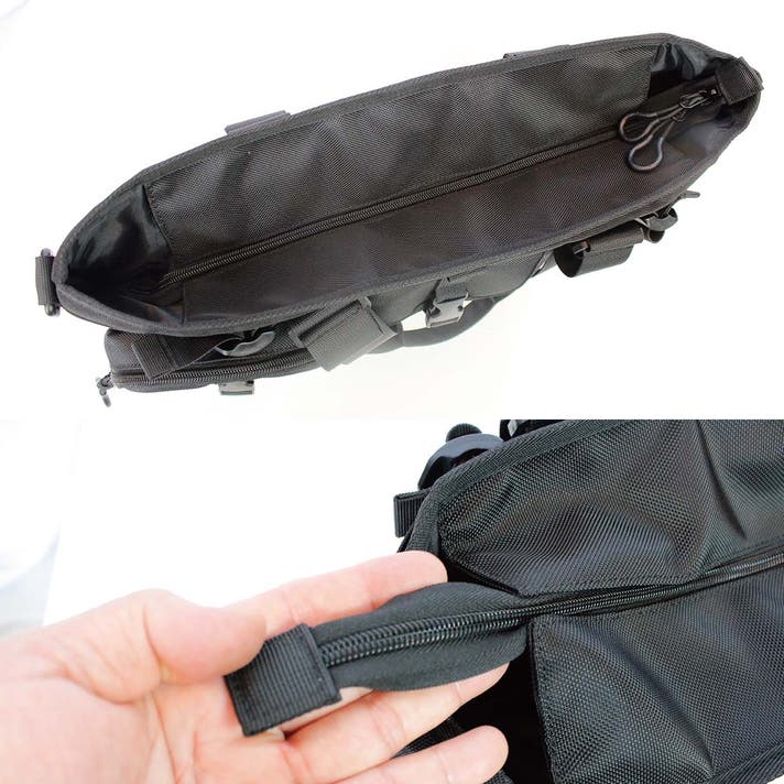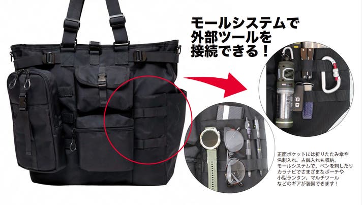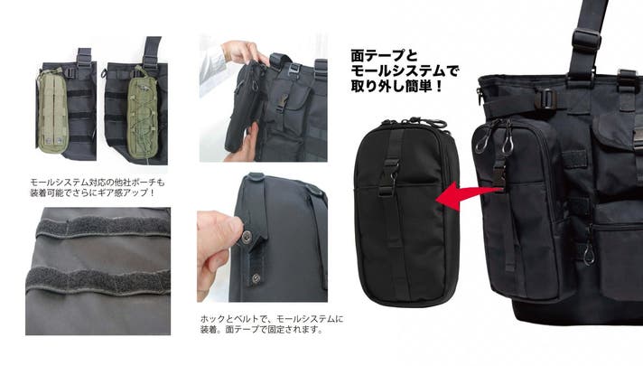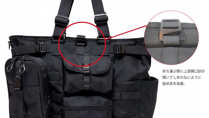 カラビナを使用すると他社製品の小物やアクセサリー類を簡単に取り付けることができます。アウトドア専用のバッグから着想を得ているタクティカルなバッグです。