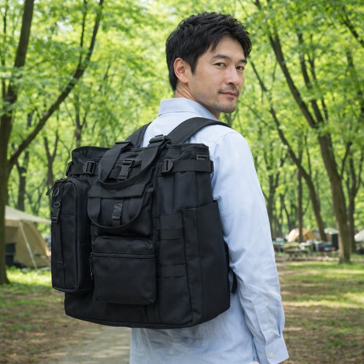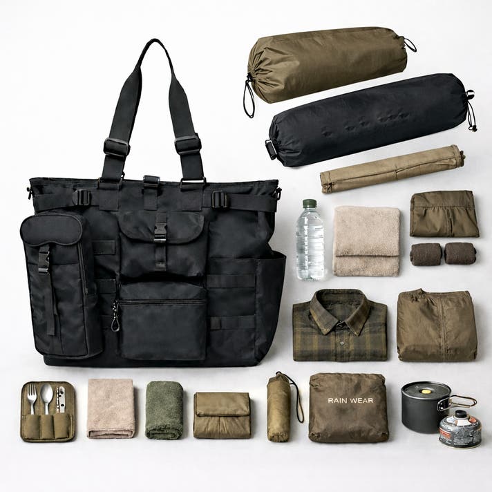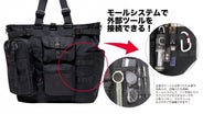 ソロ用軽量テントに寝袋つめてミニマム装備のキャンプ装備ならしっかり収納できる35Lサイズ。外側のモールシステムを活用すればさまざまなキャンプギアを装着できるギア感満載のトートバッグです。
