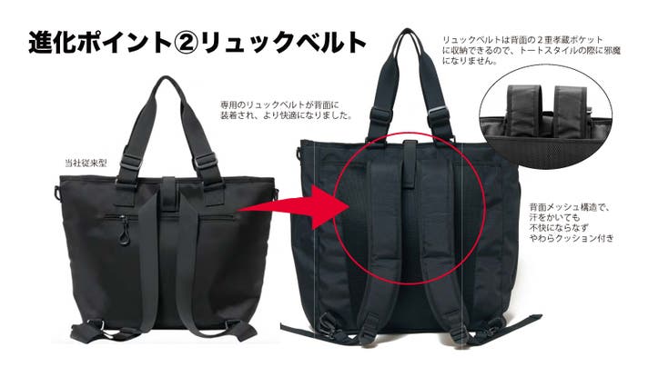 リュックベルトが、簡易的なショルダーベルトの変形スタイルから、専用のしっかりしたリュックベルトへと進化しました!さらに快適にお使いいただけるようになりました
