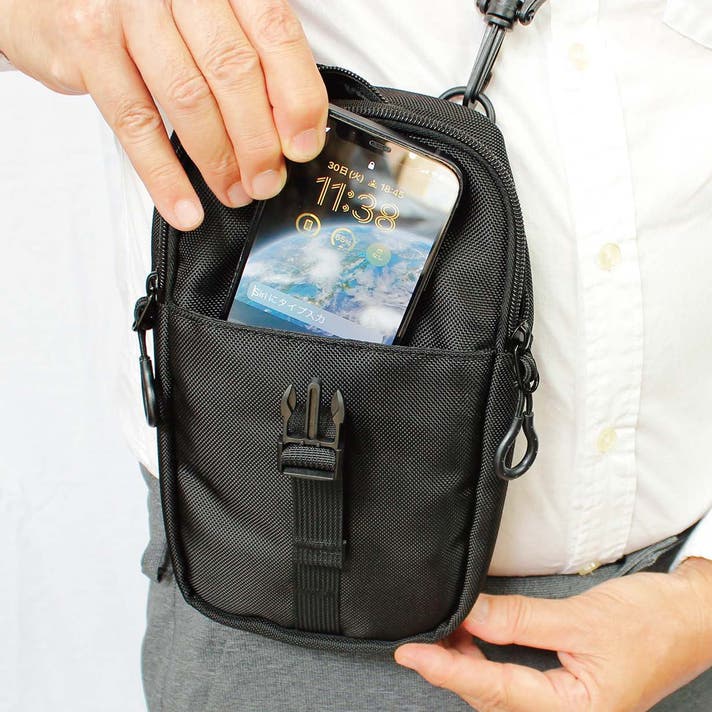 フロントポケットにはああ型のスマホもしっかり収納!落下防止にバックルベルトを装着。