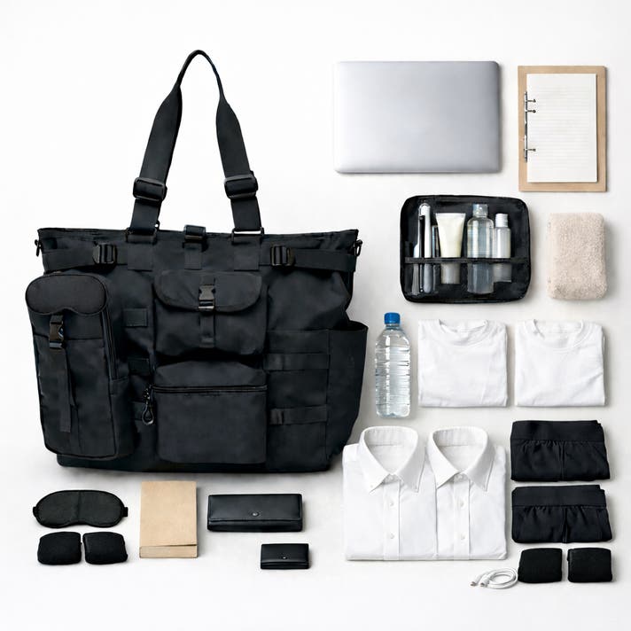 ノートパソコンに書類。2泊分の着替えも余裕で入る横型大型トートバッグ。