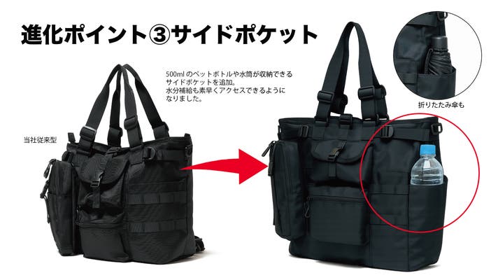 フロントにあったポケットから、専用のサイドポケットを取り付けることで、ペットボトルや折り畳み傘など、使用用途が明確にアクセスしやすいポケットとなりました。