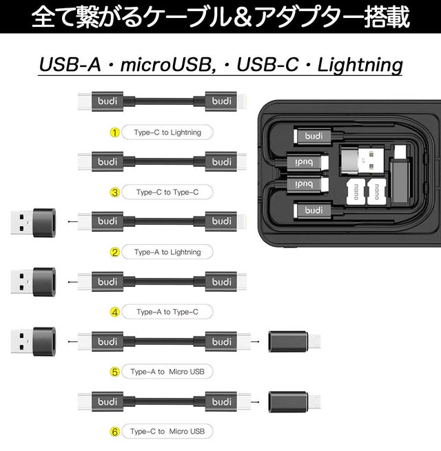 本体に収納されている2本の付属ケーブル「USB Type-C to C」「USB Type-C to Lightning」と変換アダプター「USB Type-A」「microUSB」を組み合わせ6種類の接続端子に対応。