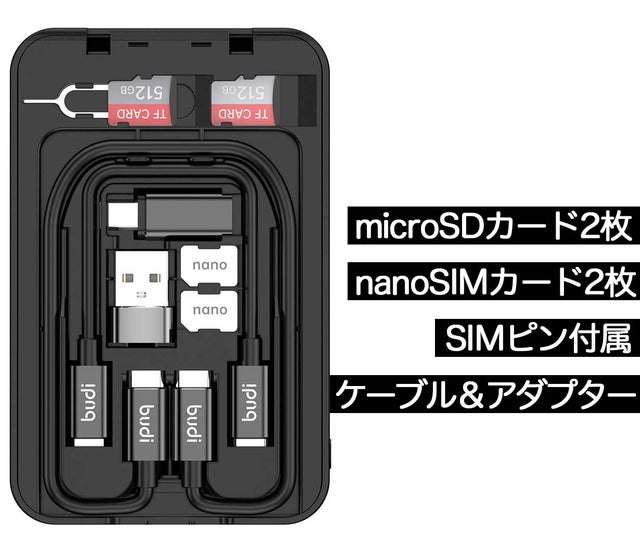 カード本体や接続端子部分を傷つけることなく「microSDカード」2枚、更にはスマホのSIMカードでも使われている「nanoSIMカード」2枚、そしてSIMカードの交換は勿論、ルーター、デジタル時計などのリセット、メディアドライブの取り出しでも使える「SIMピン」も本体に収納可能!