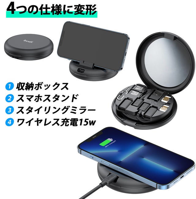 - 荷物もスッキリ!15wワイヤレス充電、データカード&SIMピン収納、スマホスタンド、鏡まで搭載
