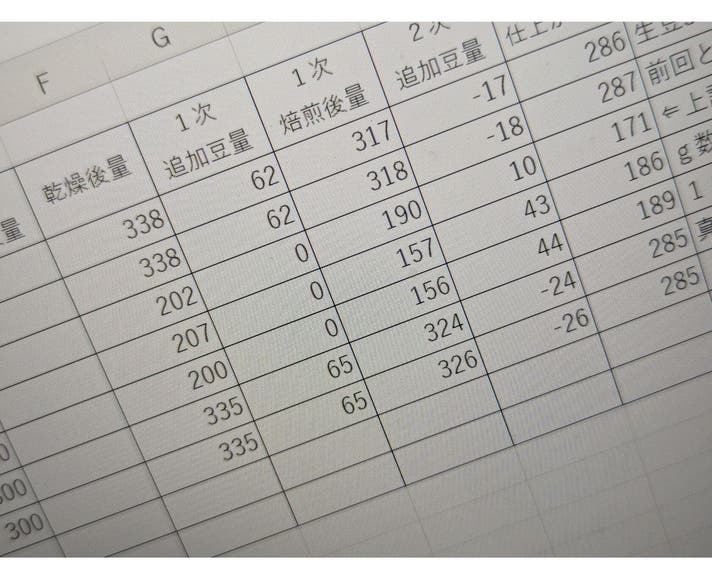▲配合比率、焙煎度毎の豆に含まれる水分量を記録したデータの一部