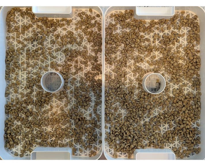 ▲2週間浸漬後の豆。ここから温度、湿度が管理された乾燥機へ。