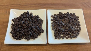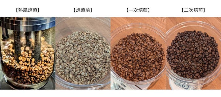 ▲熱風焙煎方式による焙煎途中と焙煎ごとの豆の状況変化