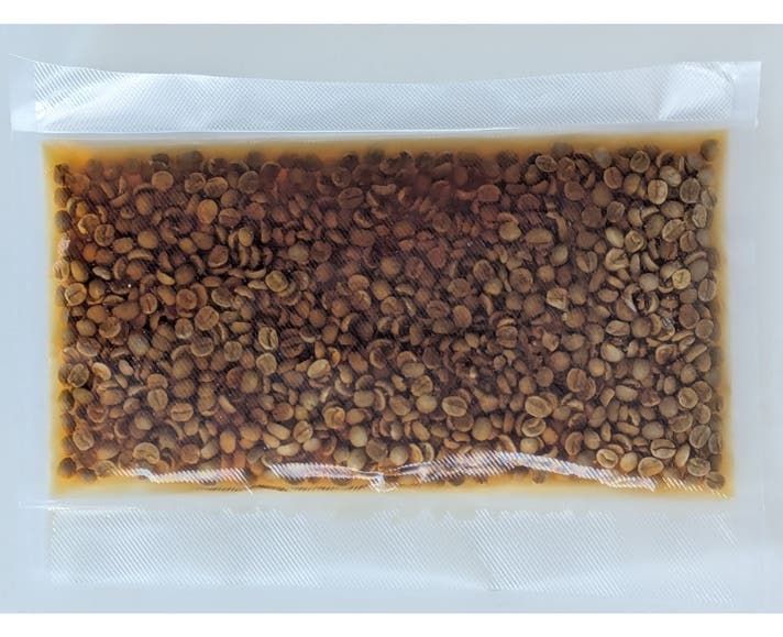 - 生豆浸漬→40℃乾燥→二度焙煎で内部に香味を組込。
