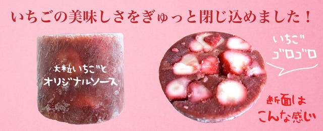 - とれたてのいちごを即冷凍、いちごの甘さそのままに自家製オリジナルいちごソースを追加しました。