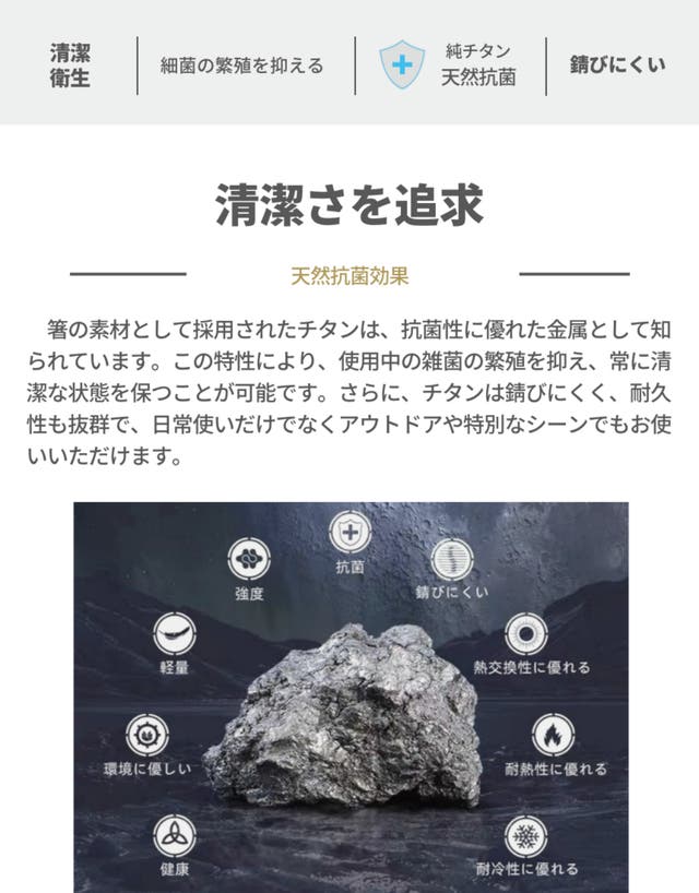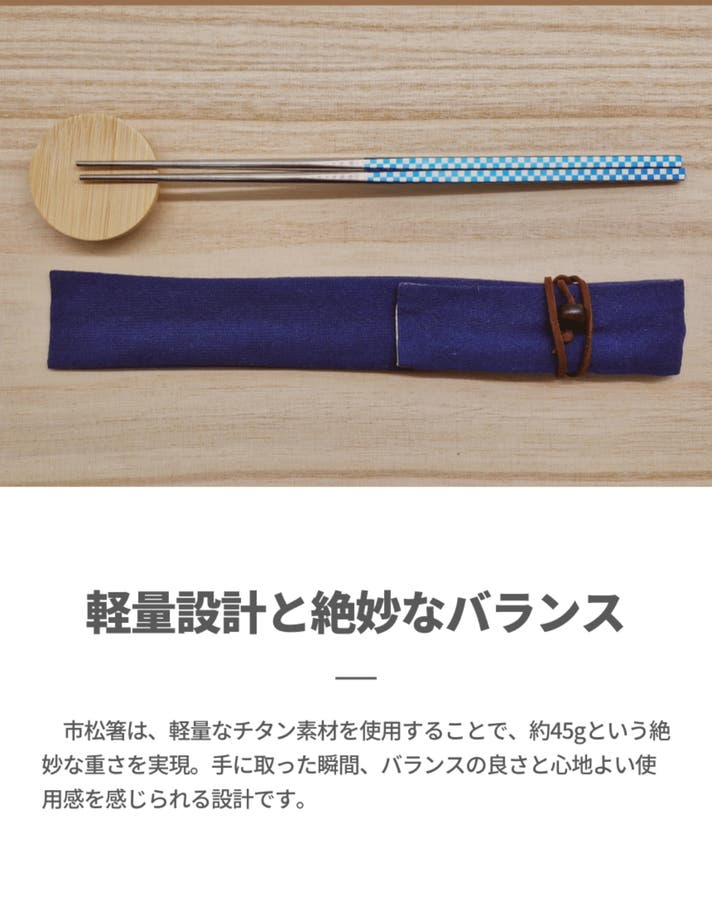 市松箸は、軽量なチタン素材を使用することで、約45gという絶妙な重さを実現。手に取った瞬間、バランスの良さと心地よい使用感を感じられる設計です。