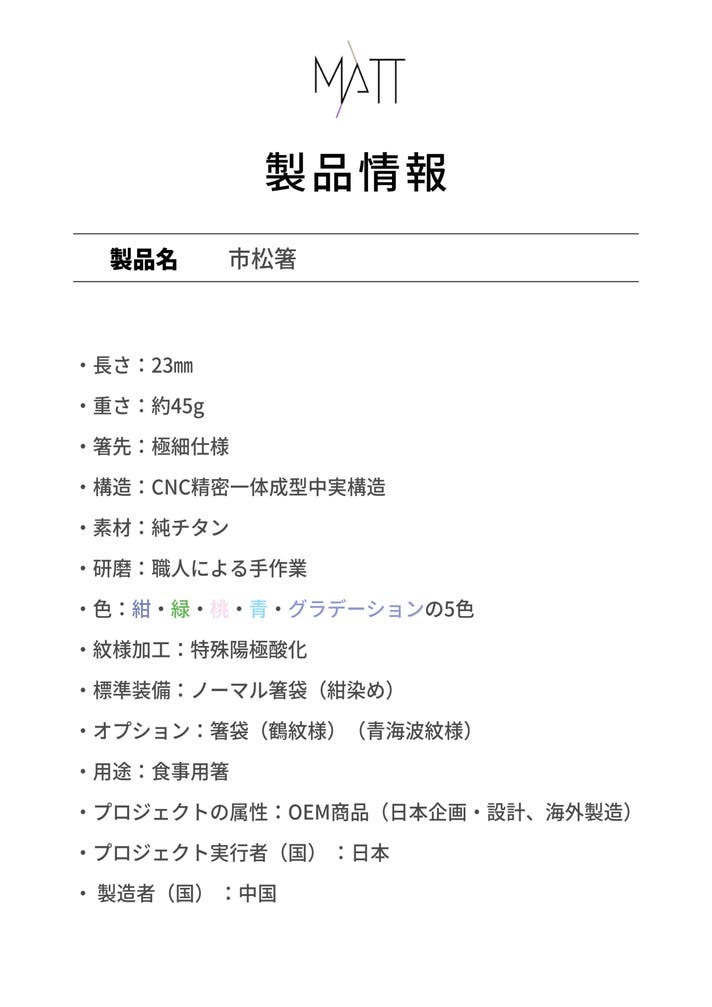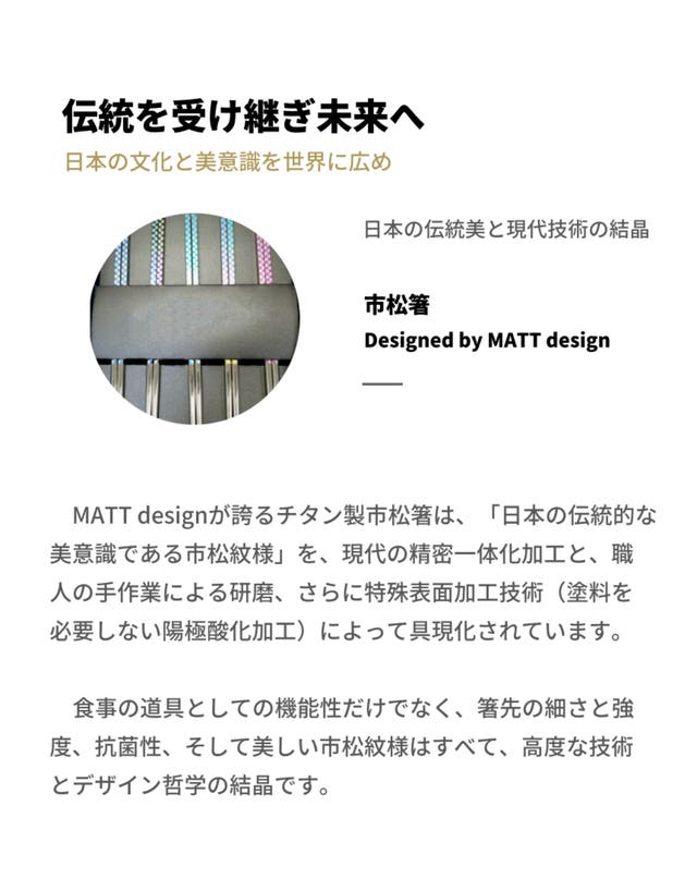 「Makuake(マクアケ)」は、実行者の想いを応援購入によって実現するアタラシイものやサービスのプラットフォームです。このページは、 プロダクトカテゴリの 「市松模様チタン製箸:伝統と現代技術が融合した究極の一膳」プロジェクト詳細ページです。