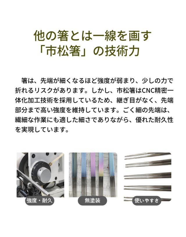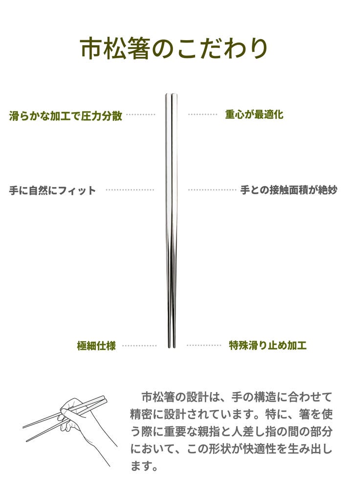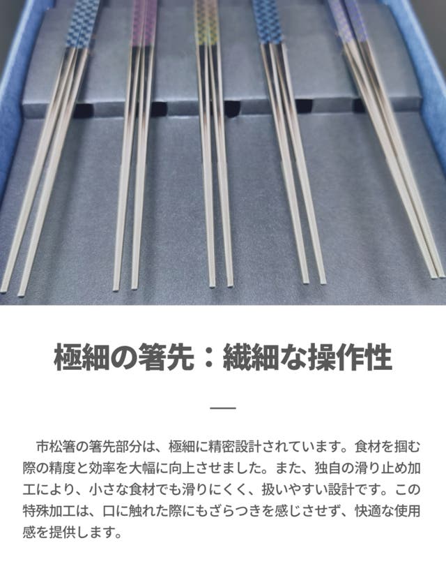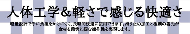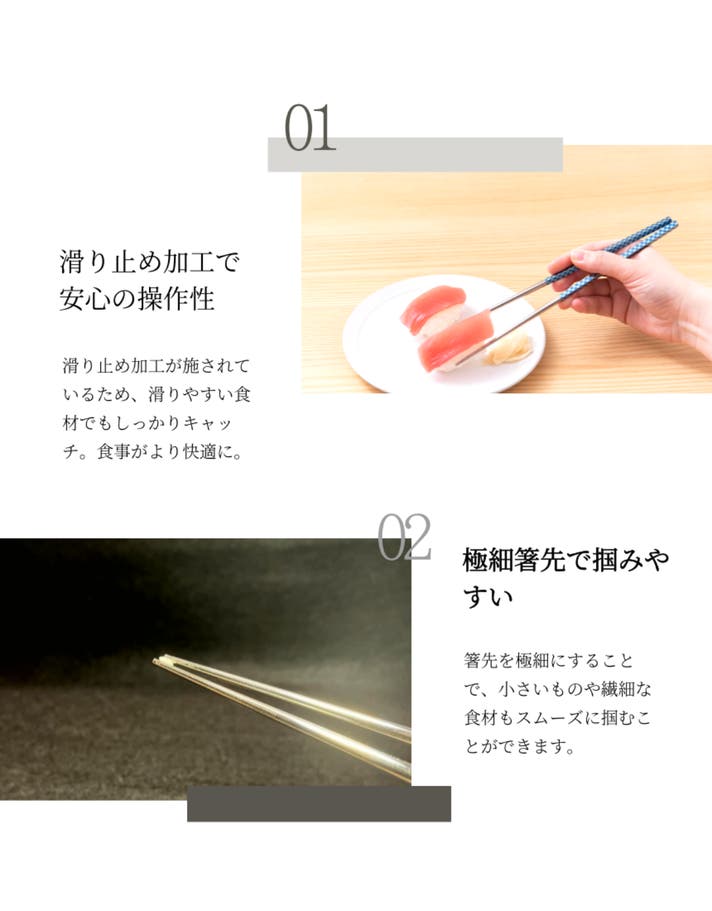 - 丸みを帯びた四角形デザイは手に馴染みやすく、滑り止め加工と極細の箸先が食材を確実に掴む操作性