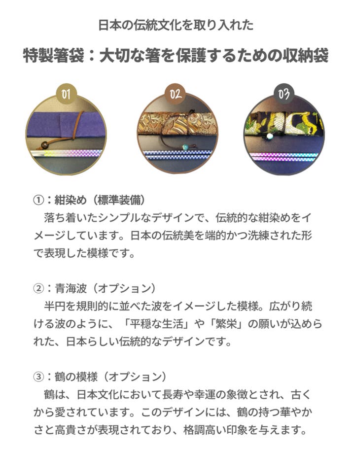 色:①紺染め(標準装備)②青海波(オプション)③鶴(オプション)