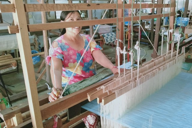 各家庭で行っていた織作業も、いまでは一つの工場で集まって織ってもらっています。このような場所でギッコンバッタンと織っています。