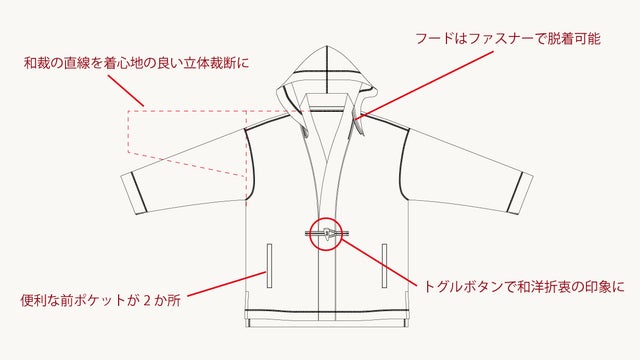 フード有りはカジュアルな印象、フードを外すと和の印象に近づきます。シーンに合わせてスタイルを選べます。ファスナーで簡単に取り外し可能です。