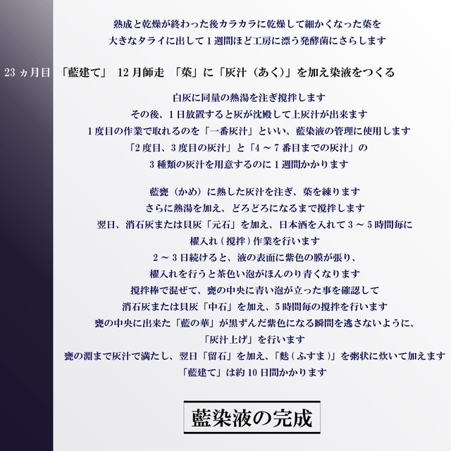 天然灰汁醗酵建藍染は藍葉を醗酵させた染料「すくも」を、堅木の灰汁で溶き、大きな甕に何日もかかり「ふすま」や「芋」、「石灰」、「灰汁(あく)」、「酒」と共に醗酵させ、その液中で幾度も染め重ねる技法で、四季のある日本で1年中藍染が出来るように考え出されました。